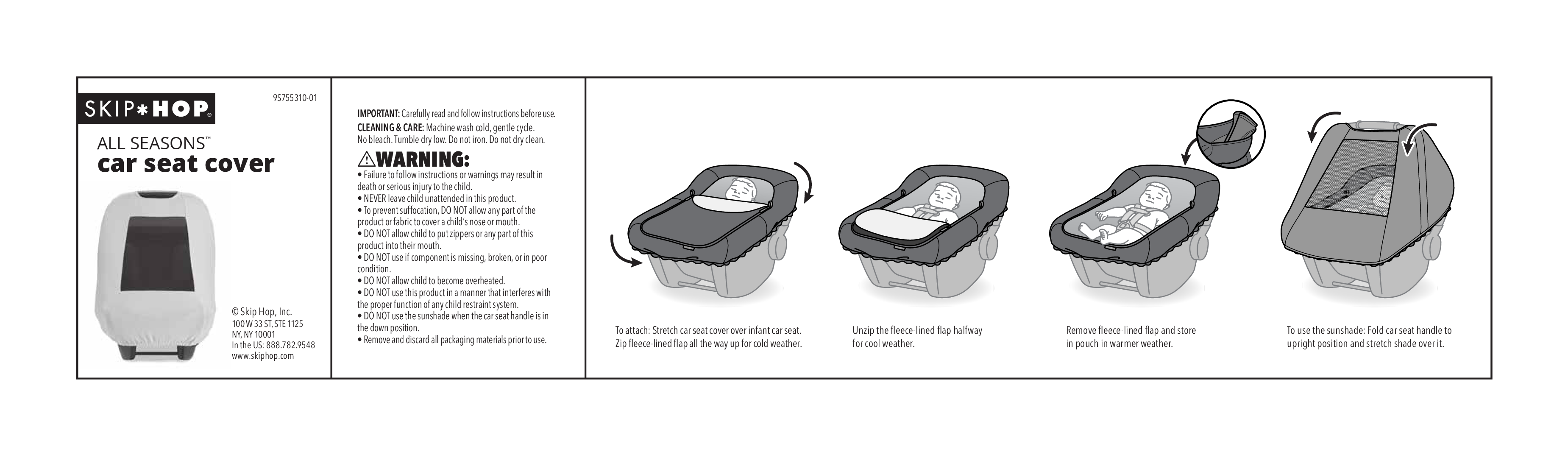 Be prepared for whatever the weather brings while heading out with baby—our All Seasons Baby Car Seat Cover has you covered. Designed to adapt for all-year comfort—from chilly days to summer heat, the machine washable car seat cover features a cozy fleece flap for winter that zips off for warmer springtime weather. When temperatures soar in summer, use the attached sunshade (hidden in a handy tuck-away pocket). It features UPF40+ sun protection, a breathable mesh inset and elastic edges that stretch to fit snugly on your carrier. Come fall, the water-repellent exterior fabric helps protect baby, while the fleece flap can be rolled up or down depending on your needs.