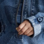 For the girl who is learning her shapes. The denim edition. Half-zip, easy on. Elastic in the sides means room to grow. Chest pocket, rocks and snacks not included. Side pockets with novelty lining. Tacked sleeve cuffs, you're welcome. Stretch denim that she'll never want to take off.